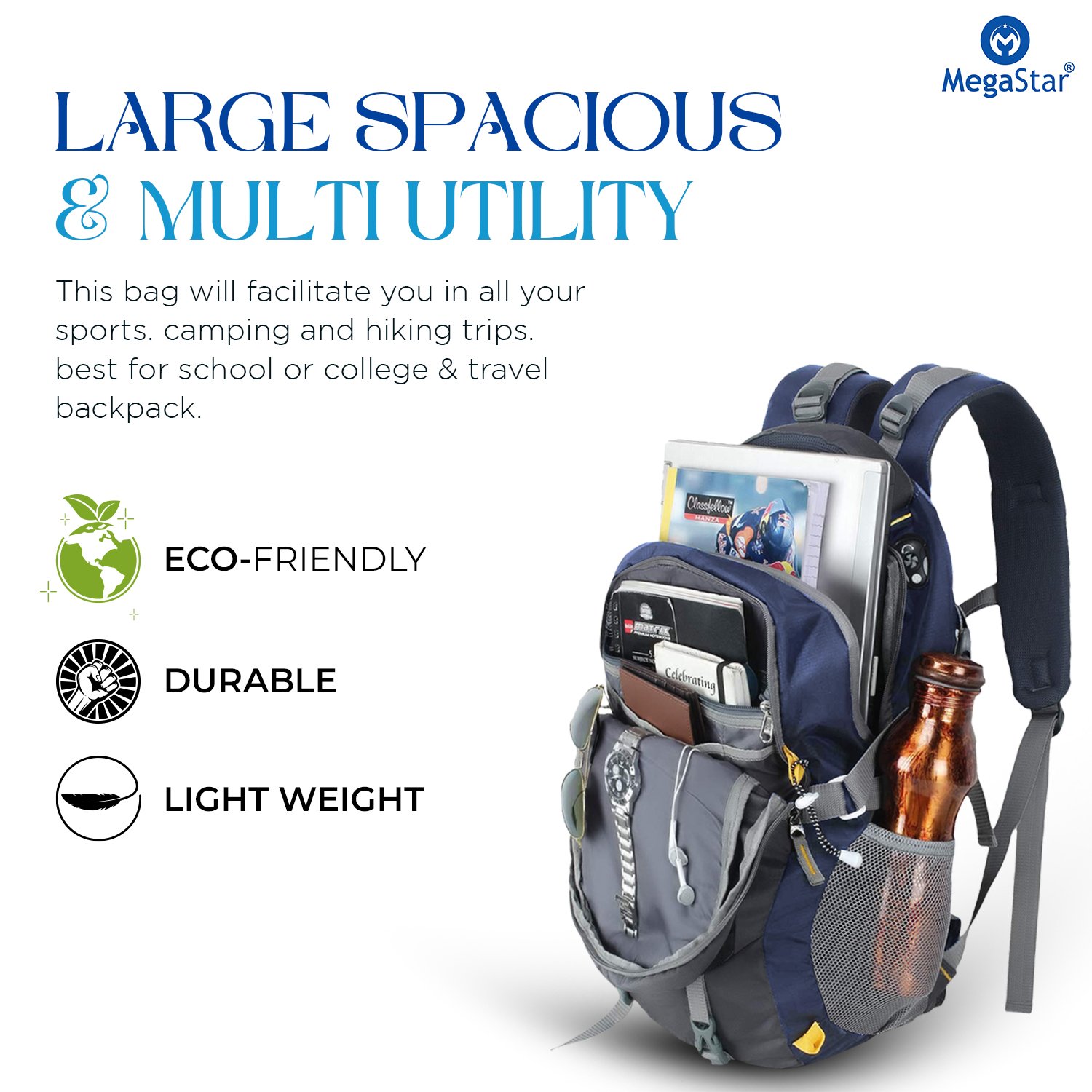 This backpack is engineered for maximum storage and convenience. The large main compartment easily accommodates clothes, gear, laptops, or outdoor essentials, while multiple front and side pockets keep smaller items neatly arranged and within reach. Two mesh bottle holders on the sides provide quick access to hydration, and extra zippers with secure pulls ensure that your valuables stay safe. Whether you’re packing for travel, hiking, college, or office use, the MegaStar Adventure Backpack gives you the freedom to carry more without feeling cluttered.