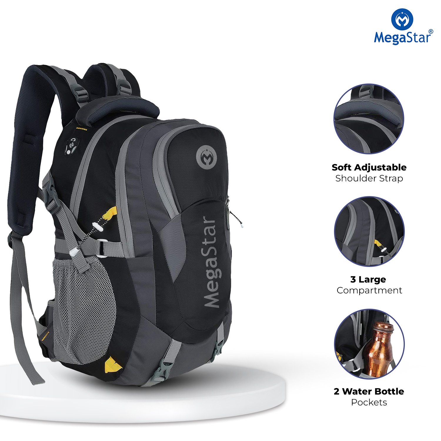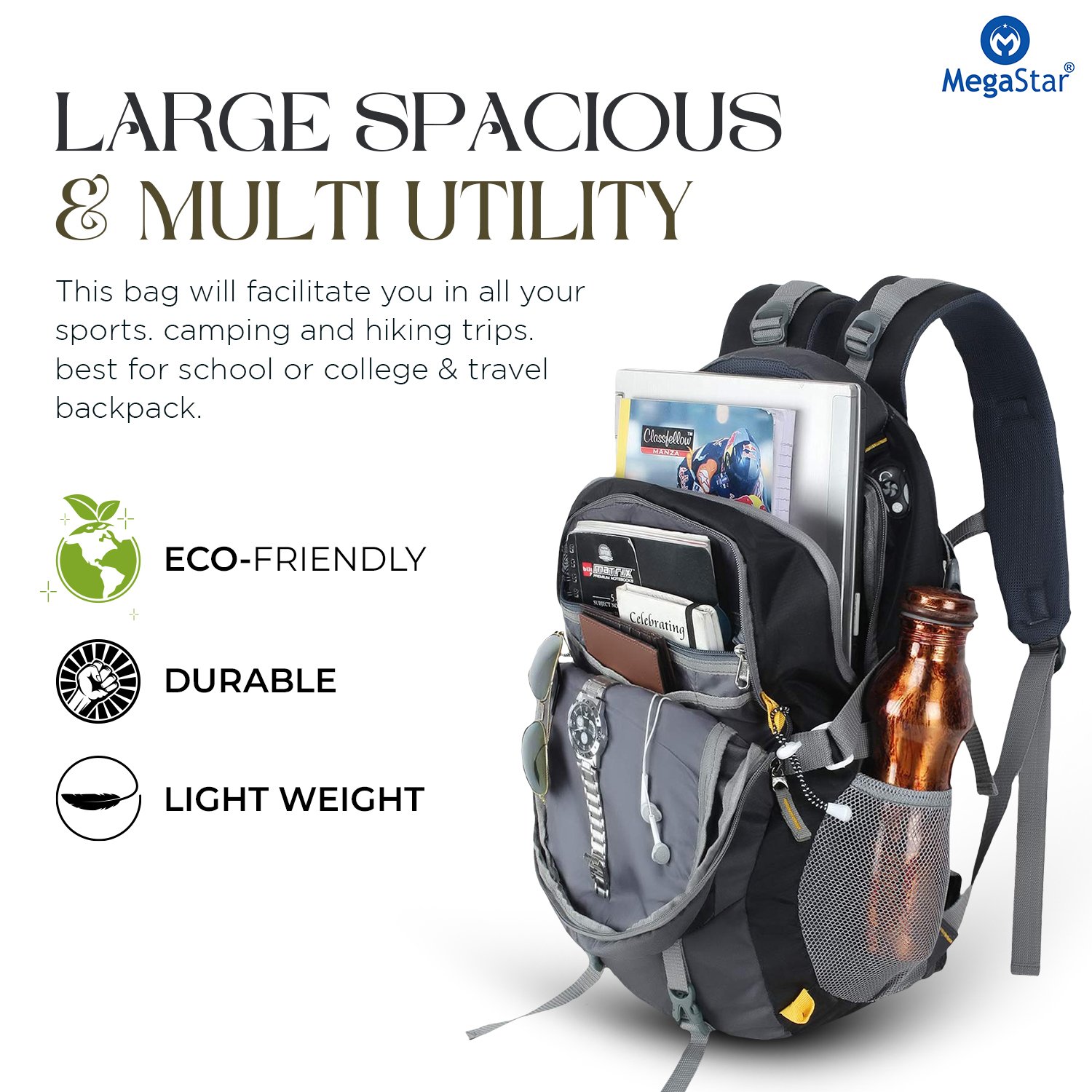 This backpack is engineered for maximum storage and convenience. The large main compartment easily accommodates clothes, gear, laptops, or outdoor essentials, while multiple front and side pockets keep smaller items neatly arranged and within reach. Two mesh bottle holders on the sides provide quick access to hydration, and extra zippers with secure pulls ensure that your valuables stay safe. Whether you’re packing for travel, hiking, college, or office use, the MegaStar Adventure Backpack gives you the freedom to carry more without feeling cluttered.